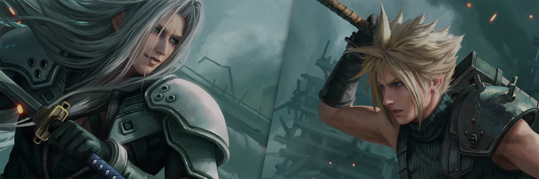 大型のクラウド&セフィロスが迫力満点!歴代作品のビジュアルを組み合わせた構成も力強く、圧倒的な存在感を放つ展示でした。